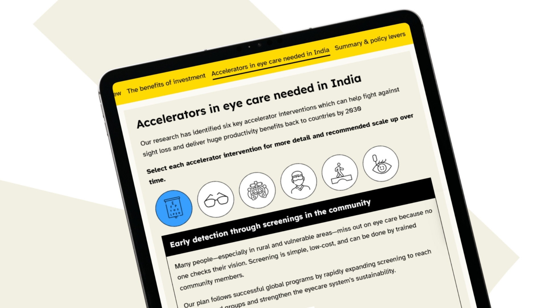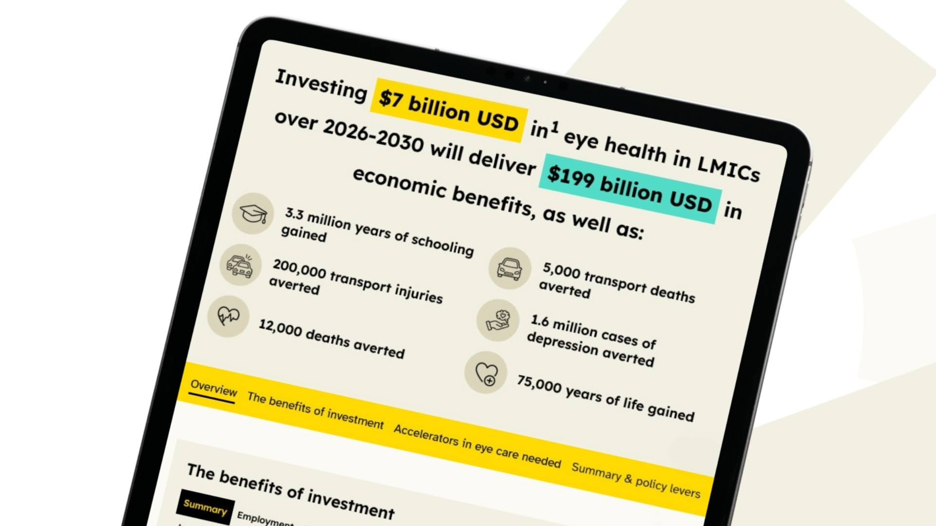 Each country profile shows how scaling affordable, proven eye health solutions drives national economic progress and social wellbeing.